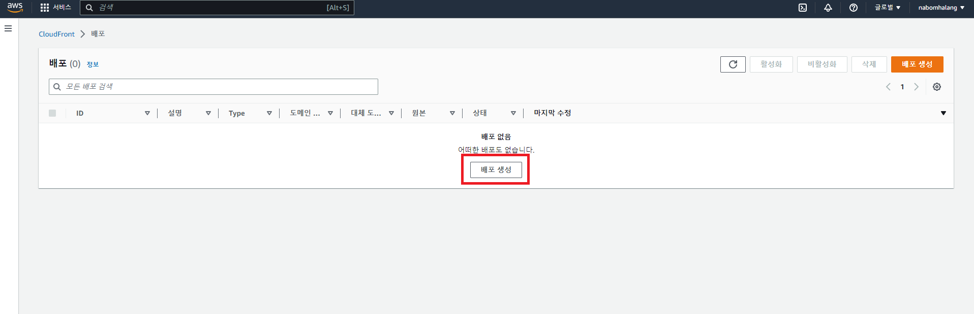 CloudFront의 메인 화면입니다. 배포 생성을 눌러주세요.