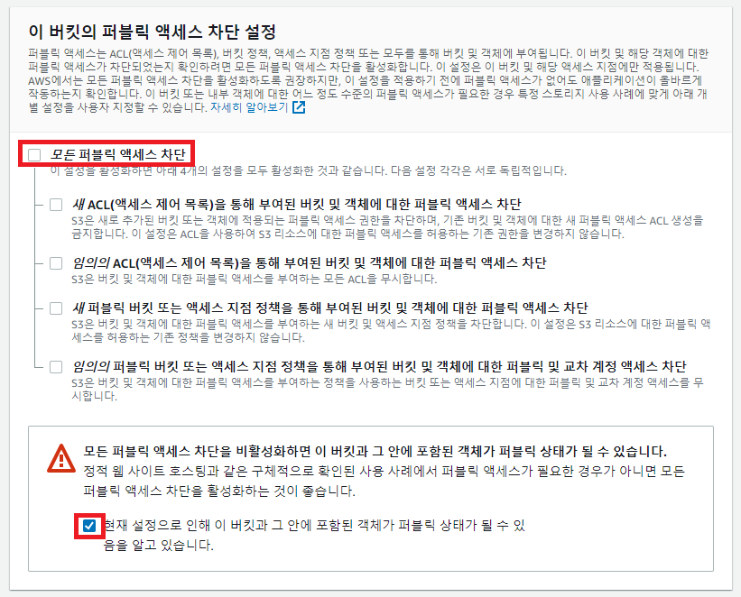 Access List 설정 - 모든 퍼블릭 엑세스 차단을 비활성화 하는 것을 선택합니다.