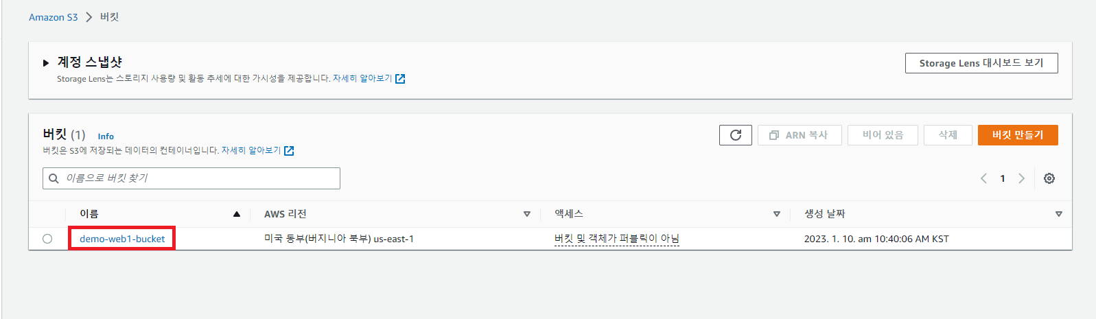 S3의 메인 페이지입니다. 빨간색 박스를 눌러서 버킷을 생성할 수 있습니다.